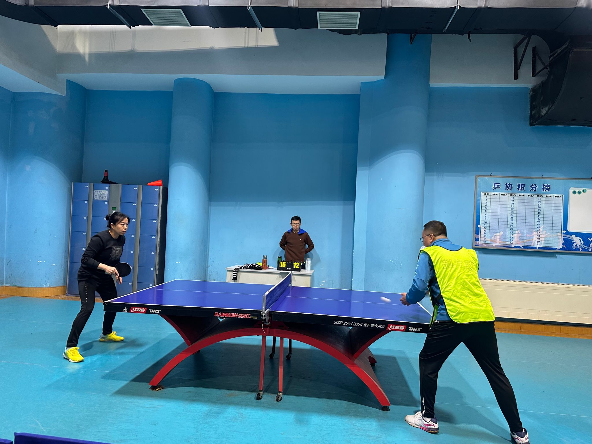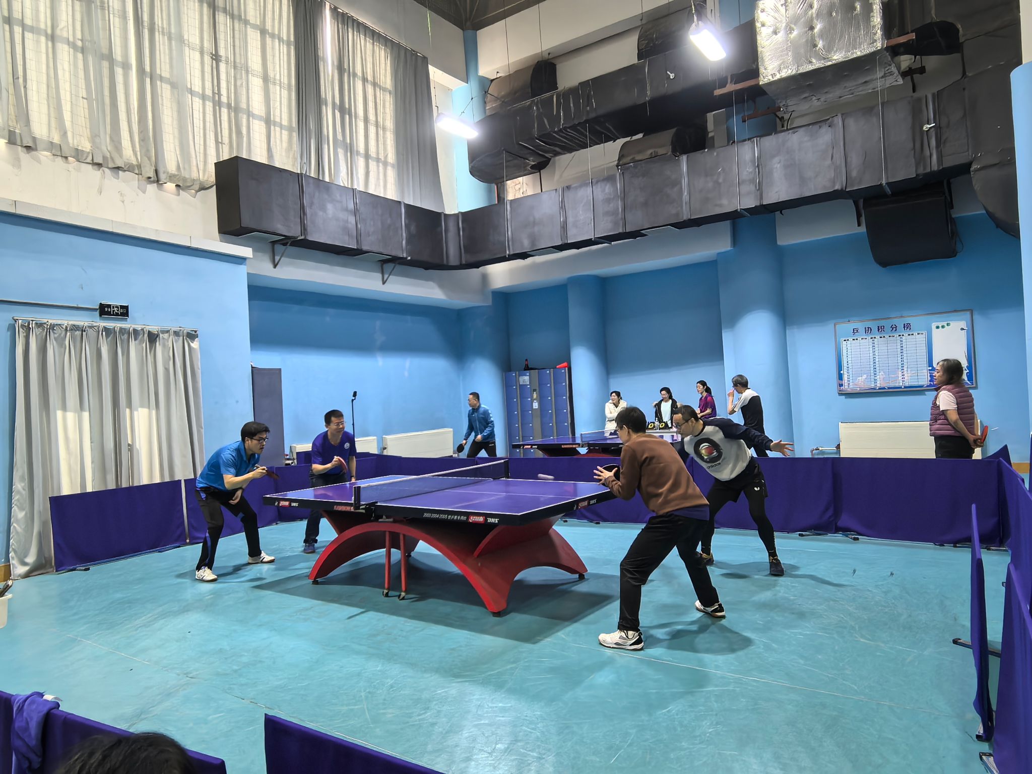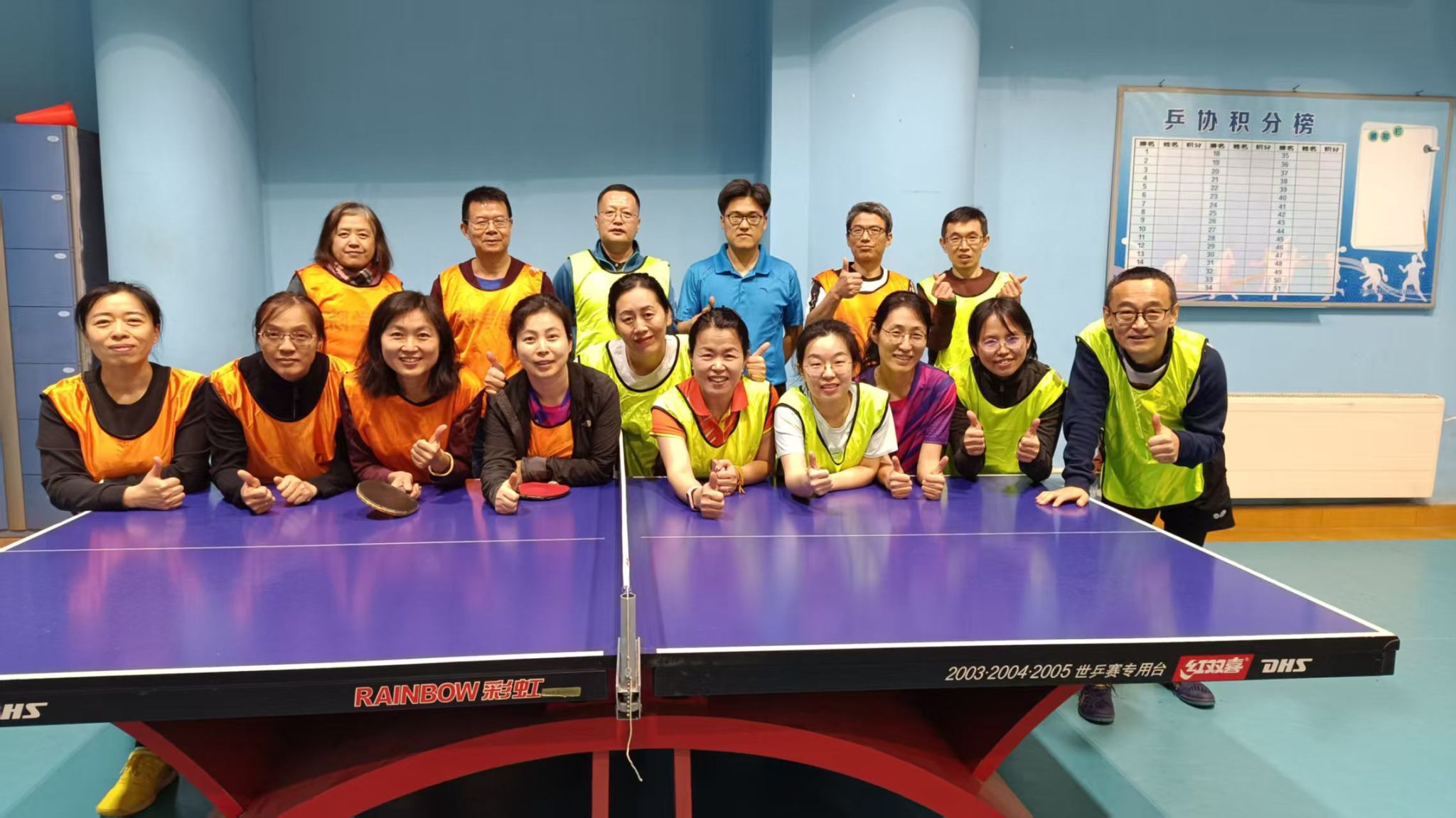 两个学院各专业教师中的乒乓球爱好者们积极参加了本次友谊赛。比赛分两个阶段,一是团体赛,分四个队打4人团体,5场3胜,评出一二三四名;二是拳皇赛,由团体赛的第一、四名组成红队,对抗第二、三名组成的蓝队,每队8人,每人20分保底,每输1球减1分,直至某方所有队员分数耗尽分出胜负。比赛过程中,双方的每位队员都顽强拼搏,赛出了水平,收获了友谊,体现了个体能力与团队互帮互助的精神,展现了两个学院教职工健康向上的精神面貌。