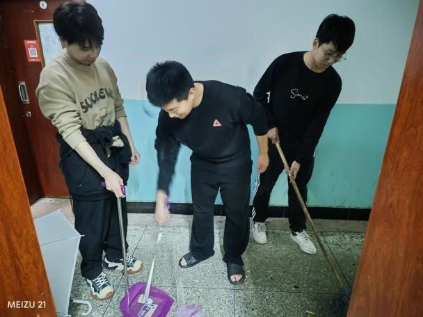 活动伊始,班级做了详细的计划和分工,由于天气寒冷且伴随大雨,考虑到同学们的身体因素,根据同学们所在的不同的寝室划分了清扫区域:每个宿舍清扫自己对应宿舍周边的走廊窗户、地板以及踢脚线,确保每个角落都能得到彻底的清洁。每个寝室都自发地准备了必要的清洁工具,如扫帚、拖布、抹布、垃圾袋等。