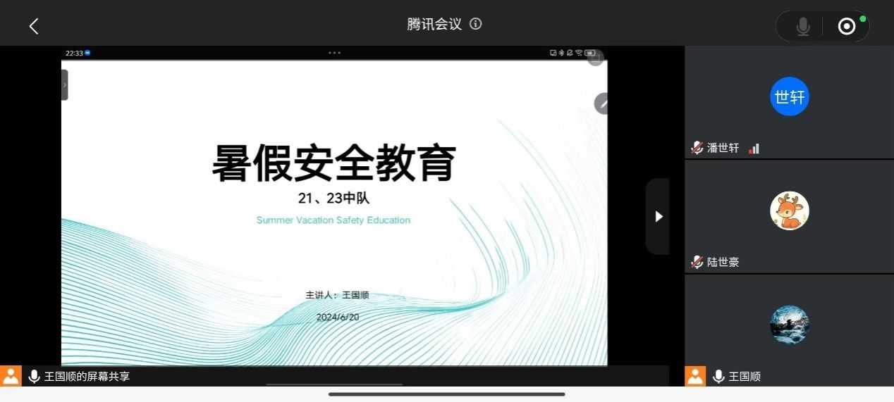 随着期末考试的陆续结束,暑假即将到来。为进一步加强暑期安全管理提高同学们的安全防患意识,3044am永利集团3044noc2021和2023中队积极响应学校号召,于6月20日在线上召开以“暑期安全教育”为主题的中队会,2021、2023中队全体成员参加。