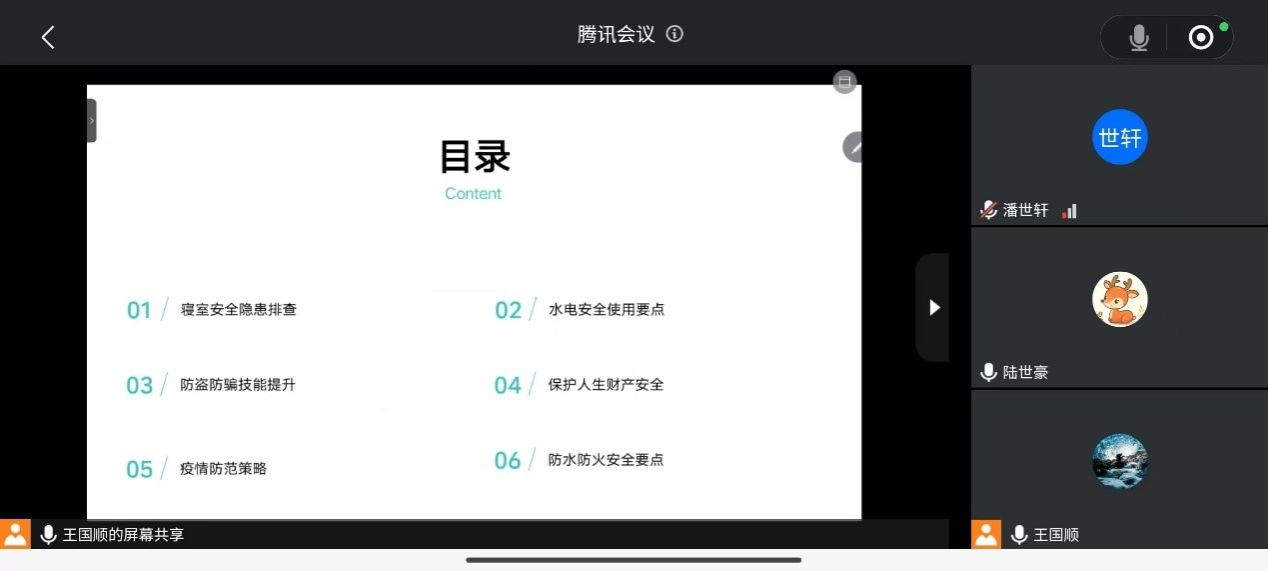 主持人王国顺向同学们叙述了暑期安全的重要性,要求同学们注意暑期的安全并加以重视。王国顺接着向大家列举了寝室安全,水电安全,防盗防骗,人身财产,疫情防范,防水防火等一系列的安全事故的危险性。指导员李安诺着重强调了寝室电器使用问题,以及疫情防控常态化要求下学生的行程安全问题。同时强调面对诈骗懂得明辨是非,提高安全意识。同学们也表示会在假期更加注意自身安全,做好防护。
