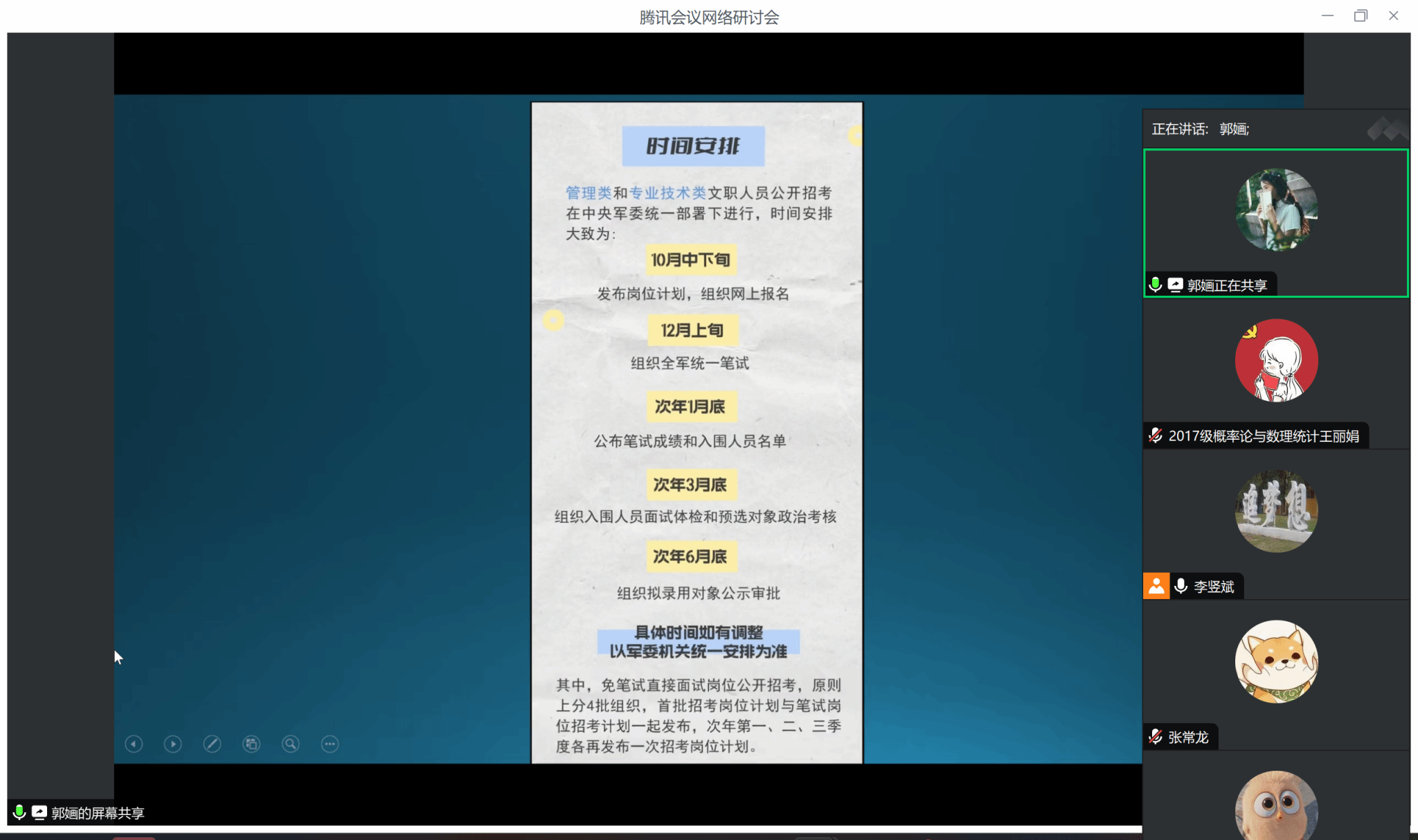 郭画校友成功加入某空军院校担任助教。她详细介绍了军队文职招考的时间安排及报考条件,并分享了自己在学习和工作中的心得体会。她的经历让同学们看到了军队文职这一特殊职业的魅力和挑战。