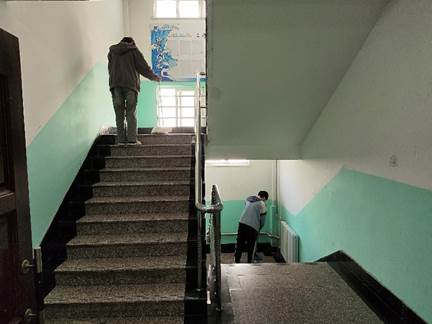 在完成校园公共卫生清理后,同学们又马不停蹄地投入到宿舍楼公共区域卫生清扫中。大家对宿舍楼内的廊道、楼梯、墙壁等公共空间进行了全面细致地清扫。从一楼到顶楼,同学们不放过任何一个角落,认真清理灰尘、擦拭扶手、铲除墙壁上的污渍。有的同学拿着扫帚仔细清扫楼梯缝隙的灰尘,有的同学用抹布认真擦拭廊道的栏杆。经过大家的共同努力,宿舍楼公共区域变得干净整洁,为同学们营造了舒适的生活环境。