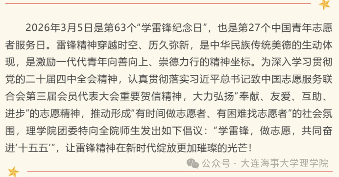 学雷锋,不止于三月,更在于朝朝暮暮。此次系列活动中,理院学子将誓言化为行动,把精神融入日常。无论是致敬英雄的思想洗礼,还是深耕社区的暖心服务,亦或是美化校园的点滴付出,都是对雷锋精神最生动的注脚。征程万里风正劲,重任千钧再出发。让我们把学雷锋变成“做雷锋”,让志愿之花常开不败,让青春在践行初心中绽放芳华!
