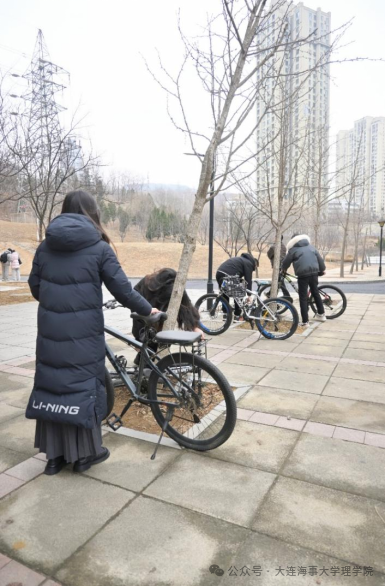 研究生中队在单车棚集合后,将乱停乱放的单车扶正归位、摆放整齐。