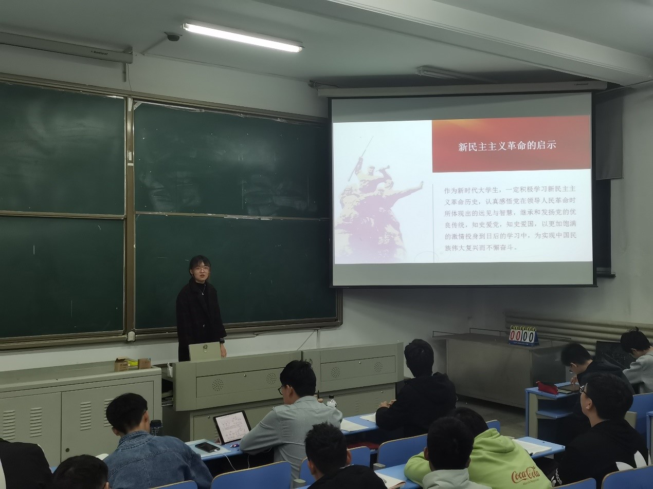 组织委员范雨萱带领同学承诺作为新时代大学生,一定会积极学习新民主主义革命历史,认真感悟党在领导人民革命时所体现出的远见与智慧,继承和发扬党的优良传统,知史爱党,知史爱国,以更加饱满的激情投身到日后的学习中,为实现中华民族伟大复兴而不懈奋斗。