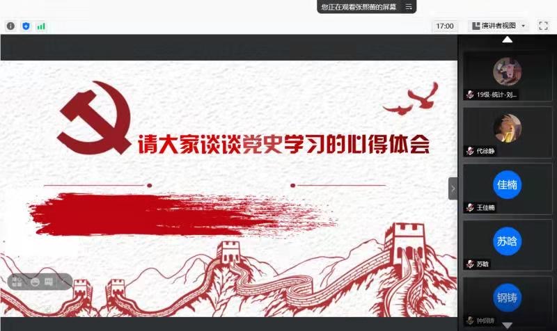 刘蕊向大家介绍了自己学习新民主主义革命史的感想:时代在前进,社会在发展,我们党要保证先进性就要不断从党史中汲取先进经验和伟大精神,作为新时代的新青年,我们要认识自己肩负的职责。杜毓玺指出,学习党史,可以使我们更加了解和热爱党。通过回