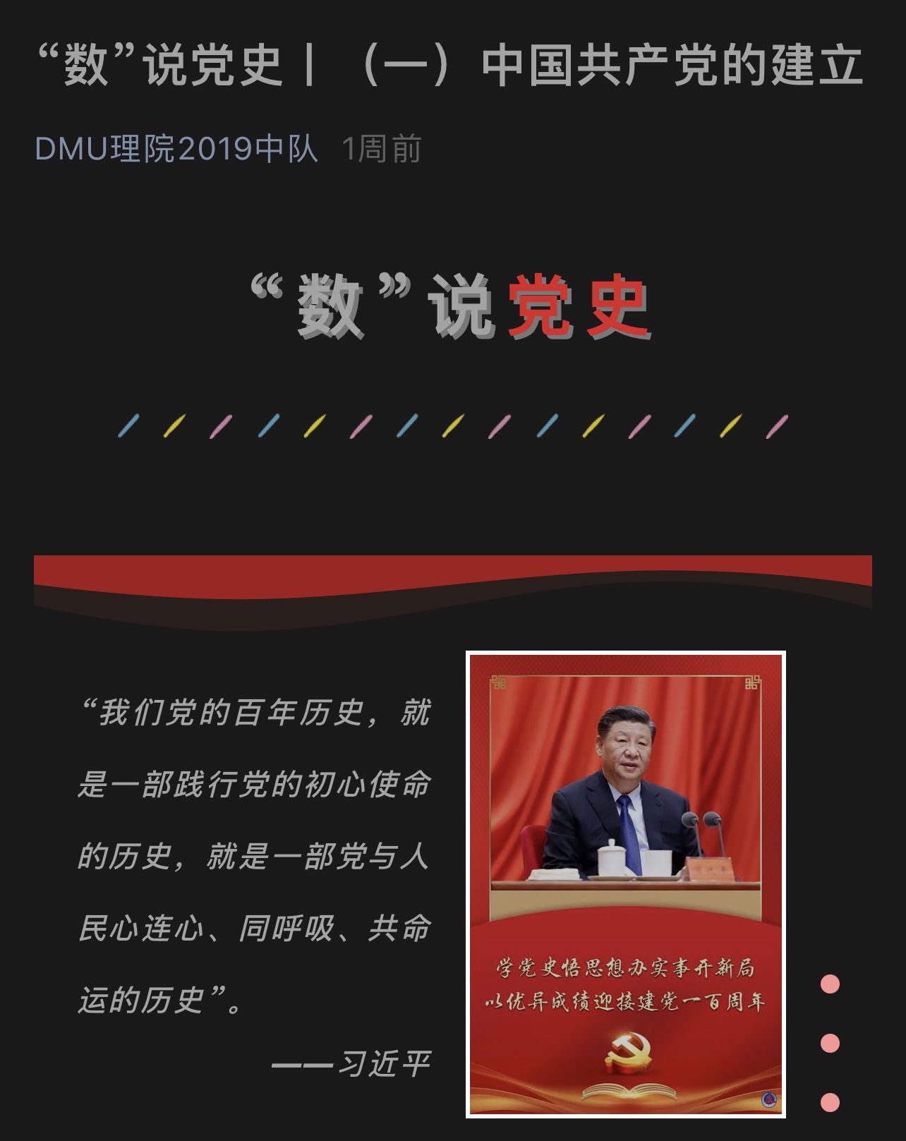 中队公众号每天定时更新<“数”说党史>系列推文及相关视频,不断培养学生学习党史的兴趣,充分引导学生深入学习党史并做到学有所思、学有所悟、学有所得。另外,中队各个班级相继开展了形式创新,内容丰富的党史学习教育主题班会,强化学生学习党史的意识,真正做到全覆盖式学习。