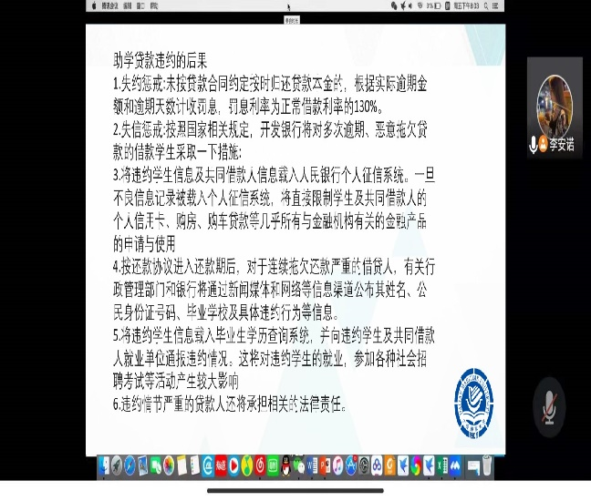 李安诺表示诚信作为中华民族的传统美德,是每个人的立身之本。树道德之新风,立道德之根本是每个大学生义不容辞的责任。国家助学贷款是党中央、国务院在社会主义市场经济条件下,利用金融手段完善我国普通高校资助政策体系,加大对普通高校经济困难学生资助力度所采取的一项重大措施。李安诺详细介绍了助学贷款的类型、举例说明助学贷款违约的后果,并表示同学们应深入了解有关诚信问题,对于助学贷款要及时还款,争做新时代诚信青年。