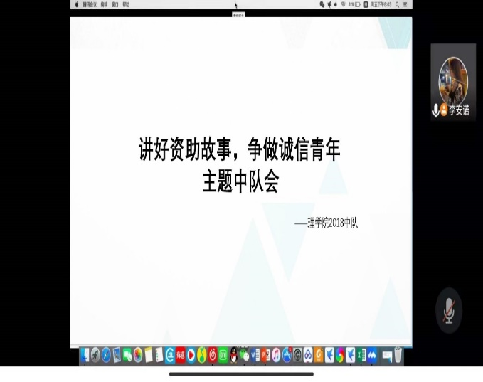 为深入贯彻党的十九大、十九届四中全会和全国思想政治工作会议、全国教育大会精神,积极推进资助育人工作,强化学生的诚信意识,引导学生争做新时代诚信青年。3044am永利集团3044noc2018中队于5月21日,通过腾讯会议召开线上主题中队会,会议由2018中队指导员李安诺主持,全体中队学生参加。