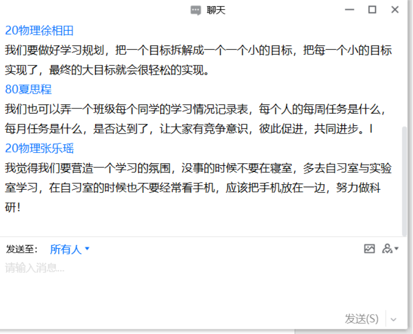 学风是学生、班级乃至一所学校的综合素质的体现之一,学风建设是高校校风的主要内容,搞好学风建设至关重要。会议伊始,各班级的国家奖学金获得者做了科研与学习上的分享,崔洪强从如何阅读文献,在科研上遇到了问题如何解决等方面与同学们进行了分享,得到同学们的广泛好评。然后由班长进行发言,沙晓松以疫情下学校的规定为开始,重新强调了学校的相关规章制度,并对班级以后的学风建设工作进行了寄托与展望。班会最后,由大家集思广益,对班级学风建设进行了讨论,在学习规划方面,我们要提前做好,并将要完成的目标分解成一个一个小的目标,先实现每一个小的目标然后在完成最后的大目标。在学费氛围方面,要多积极主动走出寝室,多去实验室与师兄师姐交流学习经验。并且班级可以制定一个学习情况记录表,将每个人的每星期计划与每个月的计划记录下来,彼此监督完成情况,互相促进,共同进步。