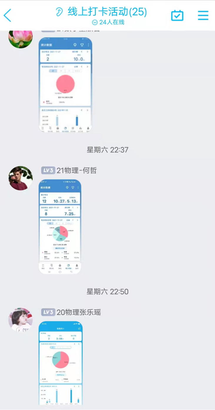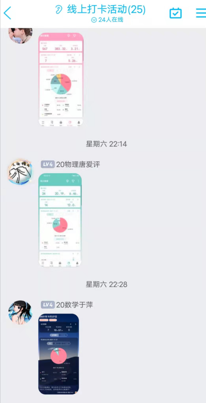本次线上学习打卡活动,根据疫情防控的实际情况,打破形式限制,利用线上学习app,通过单词记忆,英语翻译,读书感悟,学习笔记等方式。活动一经发布,同学们均踊跃报名。参与活动的同学们获益良多,大家都纷纷表示,此次打卡活动通过大家在群里交流心得,互相分享学习成果的方式营造了良好的学习氛围,使自己克服了学习惰性,找回了学习状态。