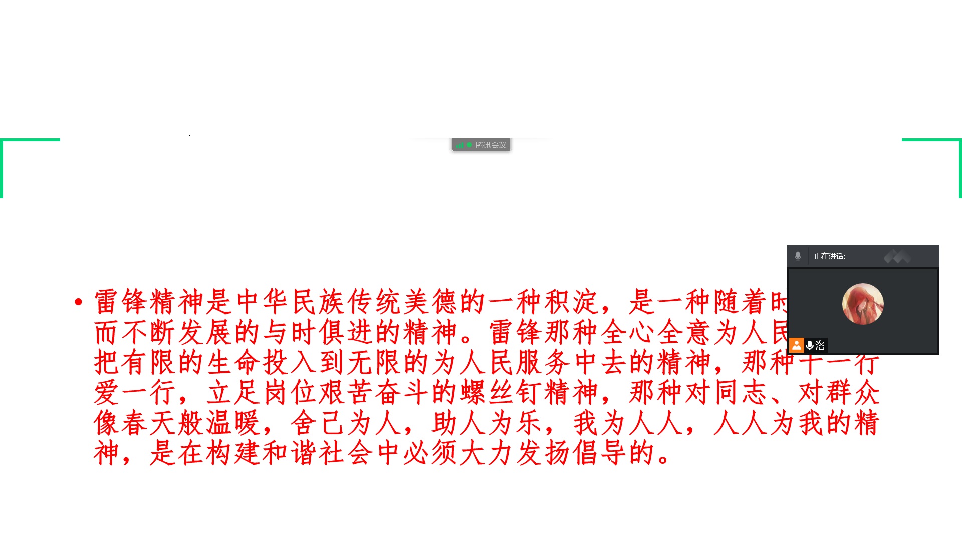 主持人讲述了雷锋的事迹和五四精神,强调了雷锋精神是中华民族传统美德的一种积淀,是一种随着时代进步而不断发展的与时俱进的精神。雷锋那种全心全意为人民服务,把有限的生命投入到无限的为人民服务中去的精神,那种干一行爱一行,立足岗位艰苦奋斗的螺丝钉精神,那种对同志、对群众像春天般温暖,舍己为人,助人为乐,我为人人,人人为我的精神,是在构建和谐社会中必须大力发扬倡导的。