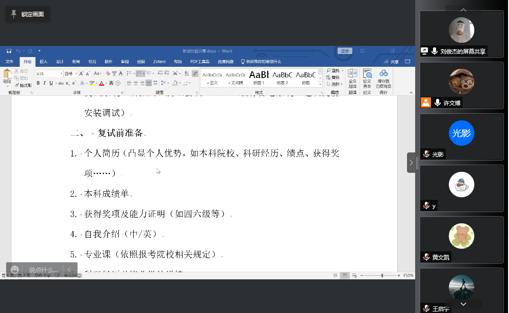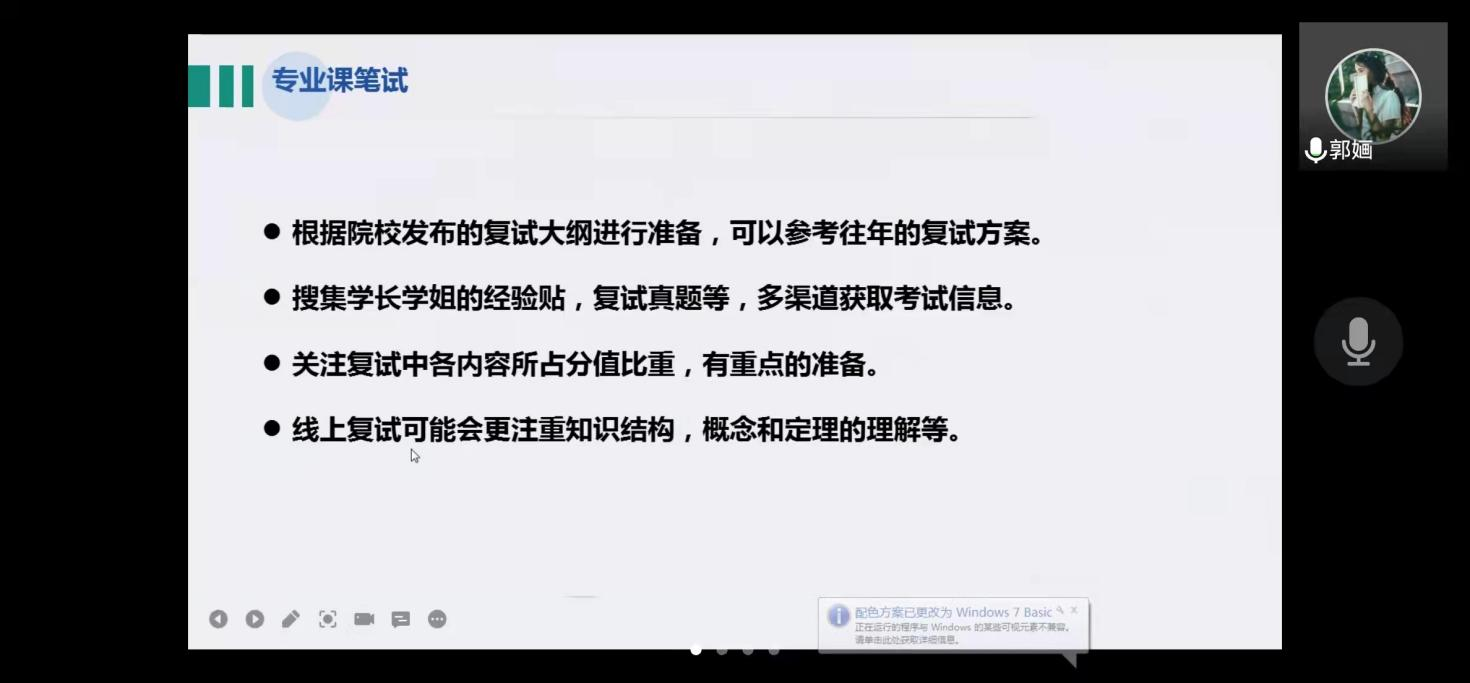 随后郭画同学介绍了她的复试经验。她表示,要多渠道获取考试信息,认真研究往年的复试大纲,做到有重点的准备。她认为,线上复试可能会更注重对概念和定理的理解,而面试的学生情况都差不多,不要因为自己准备不完美而焦虑,要相信自己,相信功到自然成。