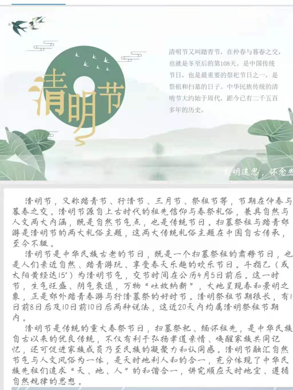 本次活动主要从清明节知识、缅怀先烈、纪念平凡人三个方面开展。清明节知识部分包括清明节来历、历史及习俗,采用图文结合的方式加深学生对清明节的了解。缅怀先烈部分结合网络资源开展“为烈士寻亲”活动,发布寻亲信息,让学生了解烈士们为祖国抛头颅、洒热血的感人事迹,体会先烈坚贞不屈、英勇无畏的高贵品质和革命精神。纪念平凡人部分,由“无人知晓”的英雄照片墙呼吁学生致敬缅怀见义勇为英雄,同时向3.21空难中不幸遇难的乘客及机组人员寄托哀思。活动最后,设置鲜花窗口及签名墙,以网络献花的形式追思逝者,同时教育学生珍惜来之不易的幸福生活。