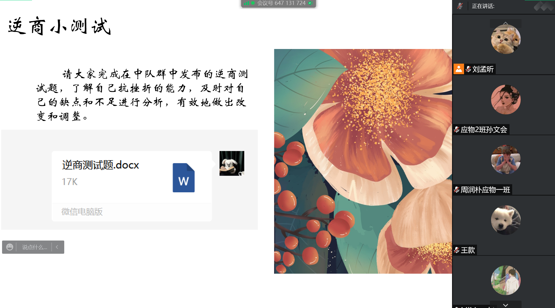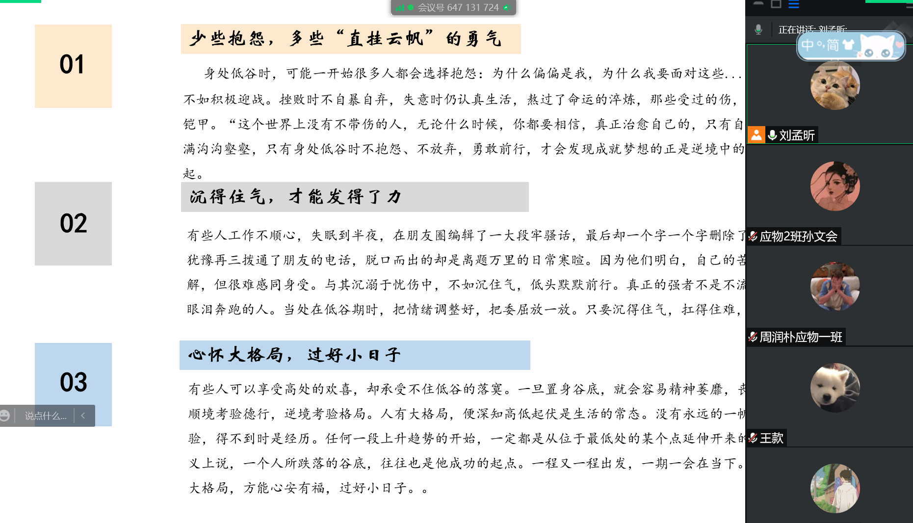 刘孟昕主要从了解逆商的重要性,培养战胜困难的勇气和能力两个方面进行讲解。刘孟昕带领学生观看视频《诸君,且听这龙吟》,以名人走出逆境的故事为例,向学生们阐述逆商对于走出逆境地重要性。还与学生们互动,引导学生完成逆商测试题并对结果进行分析,帮助学生加深对自己逆商相关水平的了解,从而提出更有针对性地逆商培养方法。会议最后,刘孟昕与学生们分享提高逆商的实用方法,呼吁学生们及时对自己的不足做出有效的改变和调整,并期望学生们可以相互给予关爱和支持,在逆境中磨练意志品质,成长为具有高逆商的新时代海大人。
