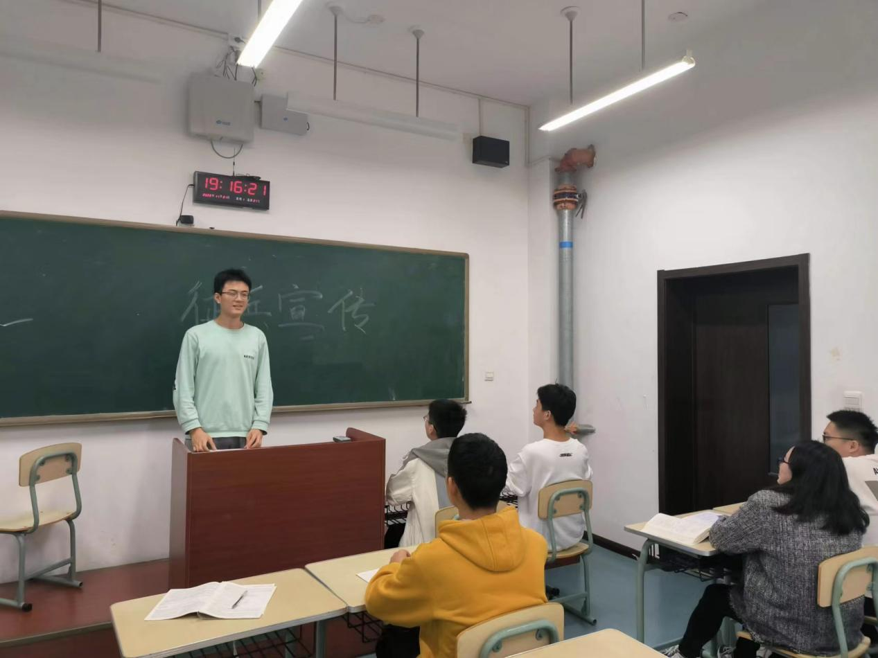 此次活动以班级为单位,以主题宣讲会的形式围绕本班情况及征兵具体政策开展。在同学踊跃发言和集体观看相关视频后,为进一步调动同学们应征入伍的积极性,各班班长详细传达了学校关于征兵宣传的相关文件要求,对本次征兵工作就报名时间、政策支持、优惠奖励、注意事项等多方面进行了说明,使同学们对于国防知识与国家征兵入伍政策有了充分的了解与认识。