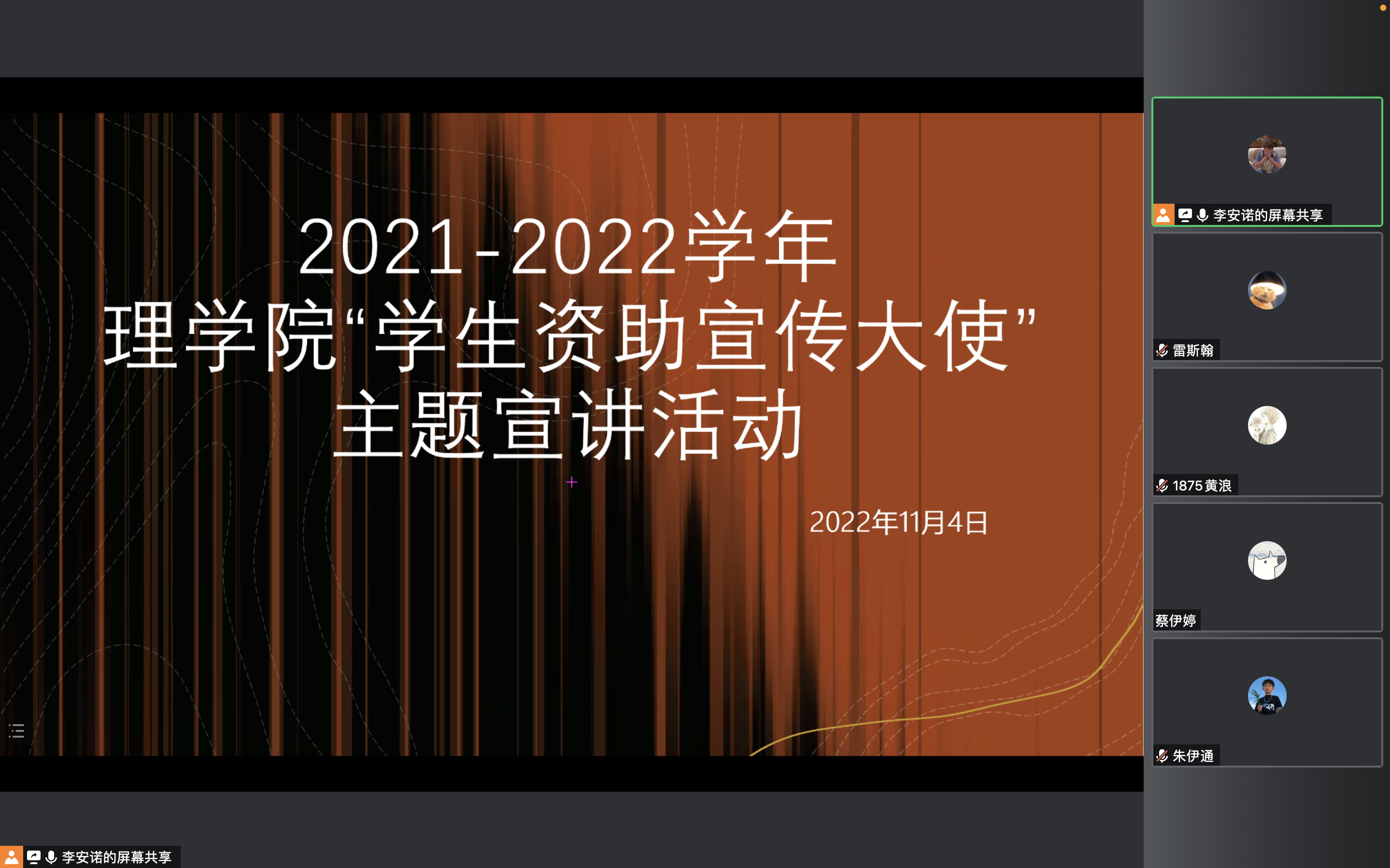 为全面落实国家资助政策,有效调动2021-2022学年获得国家奖学金的学生担当资助宣传大使的积极性,3044am永利集团3044noc于2022年11月4日在瀚海四公寓会议室举行“学生资助宣传大使”主题宣讲会,指导员李安诺出席并主持本次宣讲会。