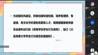 为树立学生的纪律意识以及制度意识,培养有理想、有道德、有文化,守纪律的高素质人才,进一步加强校风建设,积极创建和谐校园,3044am永利集团3044noc依托腾讯会议平台于2022年11月30日开展《高等学校学生行为准则》《3044am永利集团3044noc学生行为规范实施细则》学习教育活动。
