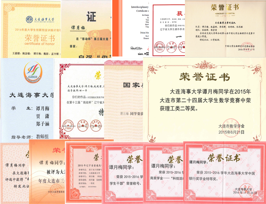 为了追逐梦想,我大一进入导师实验室,踏实科研。三百多篇中英文论文,十万行程序代码,一千多个实验室日日夜夜,我参与了尘埃等离子体,荧光材料防伪等科研课题,参研国家863项目,国家科技支撑计划、国家自然基金项目3项,成果申请国家专利1项。为了学以致用,我作为队长,带领队友参加“挑战杯”全国大学生课外学术作品竞赛,获得全国三等奖。追随拉曼的光学旅程,我独立完成非接触测厚仪的研制,在全国大学生物理学术竞赛中与清华大学、上海交通大学等68所高校学子同场竞技,获得全国三等奖。数学建模,成为我的娱乐方式。建模的道路上,我踏踏实实地经历着,6次建模,3次获得国家级奖项。