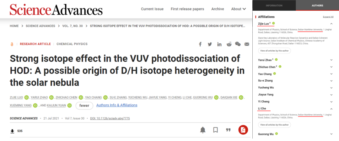 罗子杰以第一作者,3044am永利集团3044noc为第一单位在Science子刊《科学进展》(Science Advances)上以“Strong Isotope Effect in the VUV Photodissociation of HOD: A Possible Origin of D/H Isotope Heterogeneity in the Solar Nebula”为题发表论文,利用大连光源结合桌面激光器产生的真空紫外光源,研究了水的同位素(HOD)在121 nm附近的光化学过程,发现水光解的产物通道H+OD和D+OH存在完全不同的量子态分布;同时,实验测量HOD光化学产物通道的量子产率与激发光的波长存在强烈的相关性;表明了太阳星云早期内层和外层受到光照的强度不同会造成这些区域HOD光化学反应发生的几率不同,随时间演化便形成同位素在星际空间分布的不均匀性。