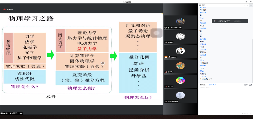 李宇从物理是什么、物理怎么做、物理怎么玩三个角度切入话题,从五个方面提出建议:尽快适应、学会思考、学会读书、对待数学的态度、如何选择,以此引导学生。最后,学生们踊跃发言,提出困惑,李宇从职业生涯规划,对生活、学业的态度等方面回答了学生的问题,为学生以后的发展方向指明了方向。