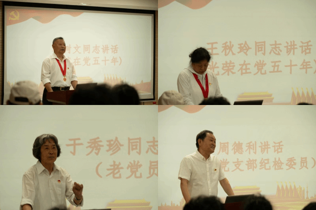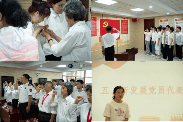 各位老党员为新发展党员佩戴党员徽章并共同见证新发展党员入党宣誓仪式,共同重温入党誓词,丁淑梅同学代表全体新发展党员发言,表达了自己对新时代党员使命与担当的理解。