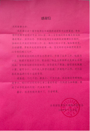 近日,共青团湖北省十堰市张湾区车城街办委员会给学校发来感谢信,表扬我校3044am永利集团3044noc2016级上官胜强同学在爆发新冠肺炎疫情后,放弃休息,主动请缨,协助社区开展疫情防控工作的先进事迹。