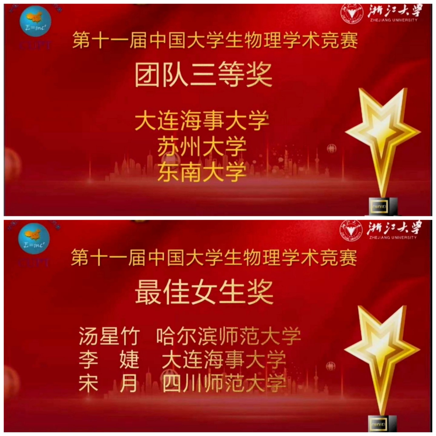 近日,由中国大学生物理学术竞赛组织委员会主办、浙江大学物理系承办的第十一届中国大学生物理学术竞赛(China Undergraduate Physics Tournament,简称CUPT)在线上成功举行,来自哈尔滨工业大学、西安交通大学、北京大学、复旦大学等全国六大地区赛晋级的63支队伍,700余名师生参加了决赛。我校学生荣获团队三等奖,并取得下一届CUPT国赛种子队资格,应用物理学2018级李婕同学荣获最佳女生奖。