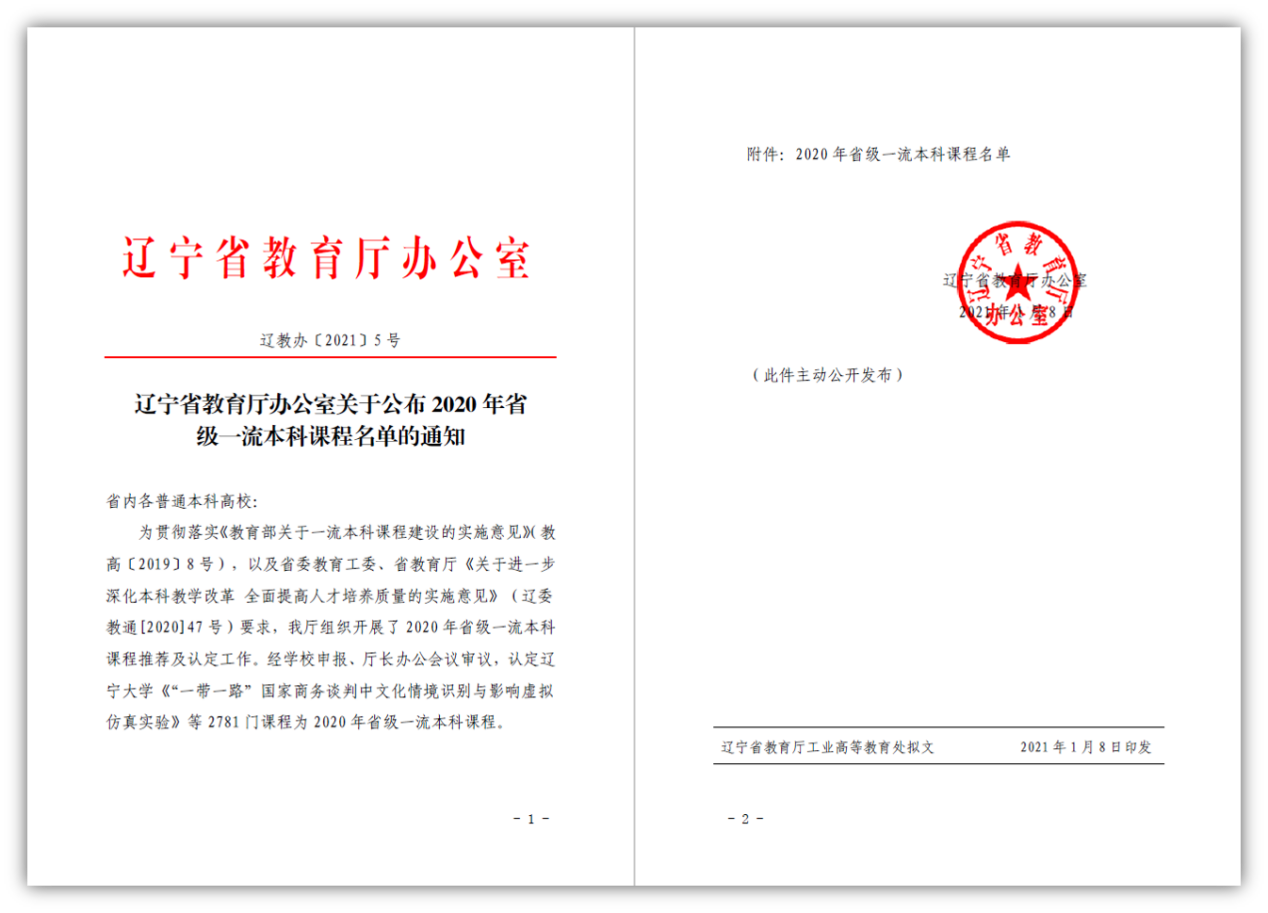 近日,辽宁省教育厅发布了“关于公布2020年省级一流本科课程名单的通知”(辽教办〔2021〕5号),认定2781门课程为2020年省级一流本科课程。其中,我院8门课程获批为省级一流本科课程,具体名单如下: